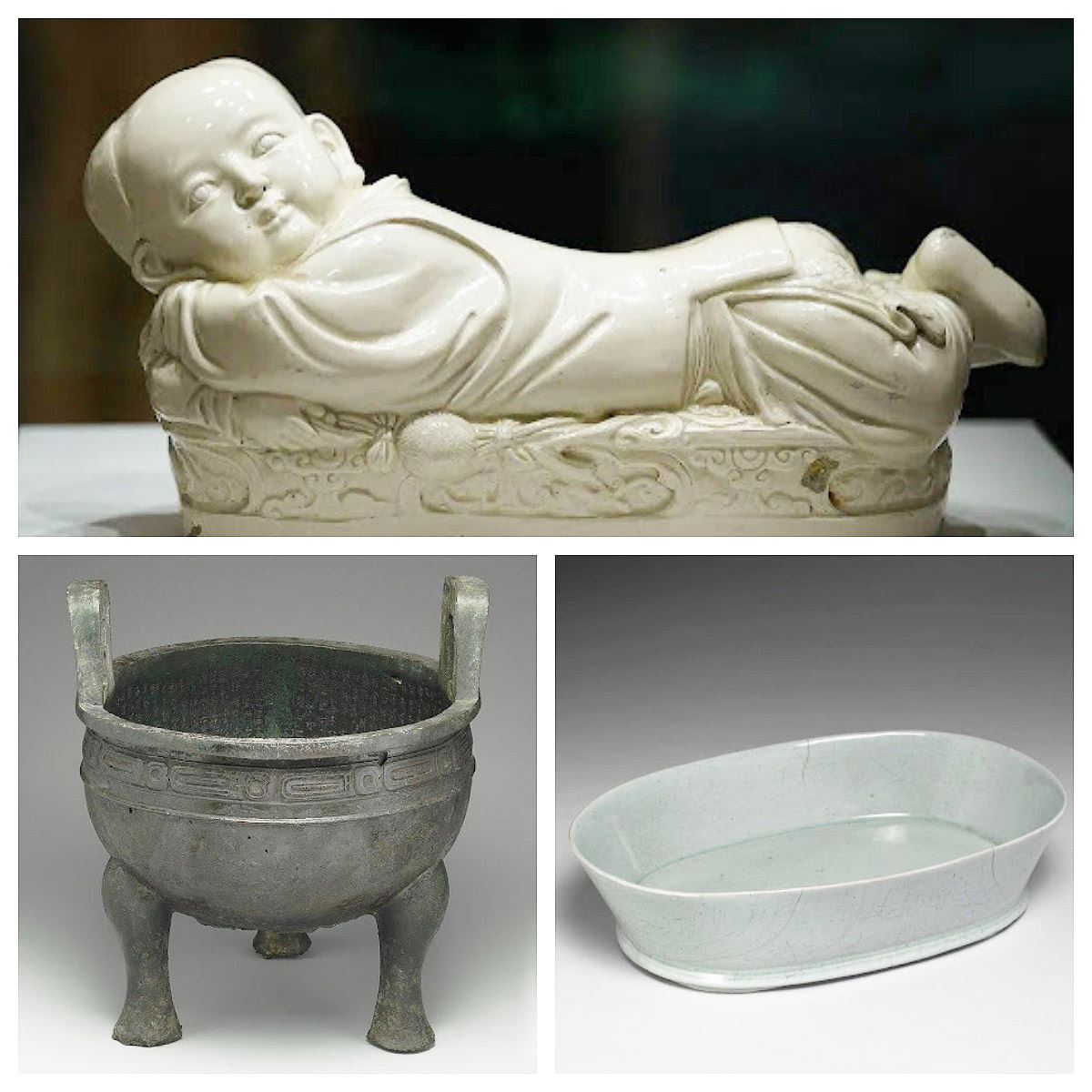 最後劉老師介紹了定窯白釉孩兒枕,定窯匠師獨具匠心,將瓷枕塑造成一個天真、活潑可愛的男孩兒形象。西周青銅國寶毛公鼎,腹內刻有500字金文冊命書,字數為舉世銘文青銅器中最多。北宋汝窯青瓷無紋水仙盆是北宋徽宗年間的御用器皿,由汝窯燒制,其以天青色純淨沒有開片的清朗釉色著名於世。(圖三)