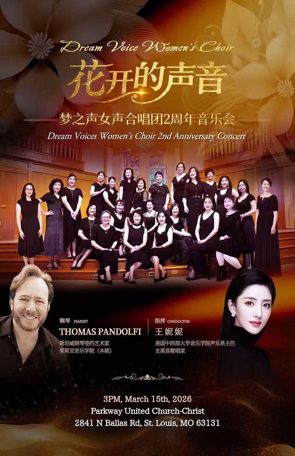 音樂會由密蘇里州中西部大學音樂學院聲樂系主任、女高音歌唱家王妮妮 擔任指揮,鋼琴伴奏特邀美國著名鋼琴家Thomas Pandolfi 傾情合作。